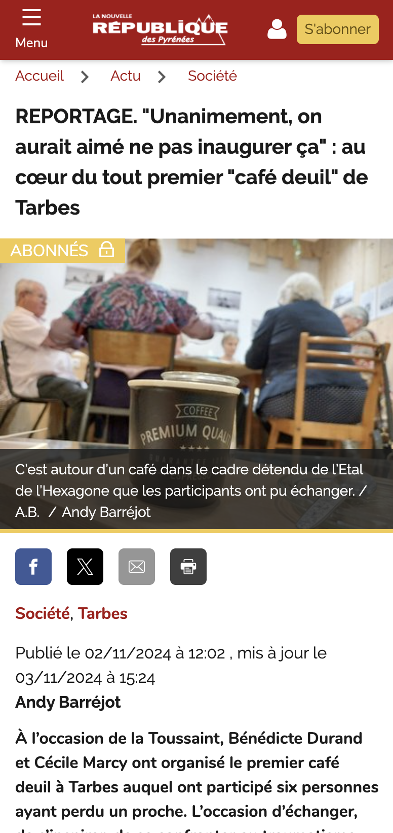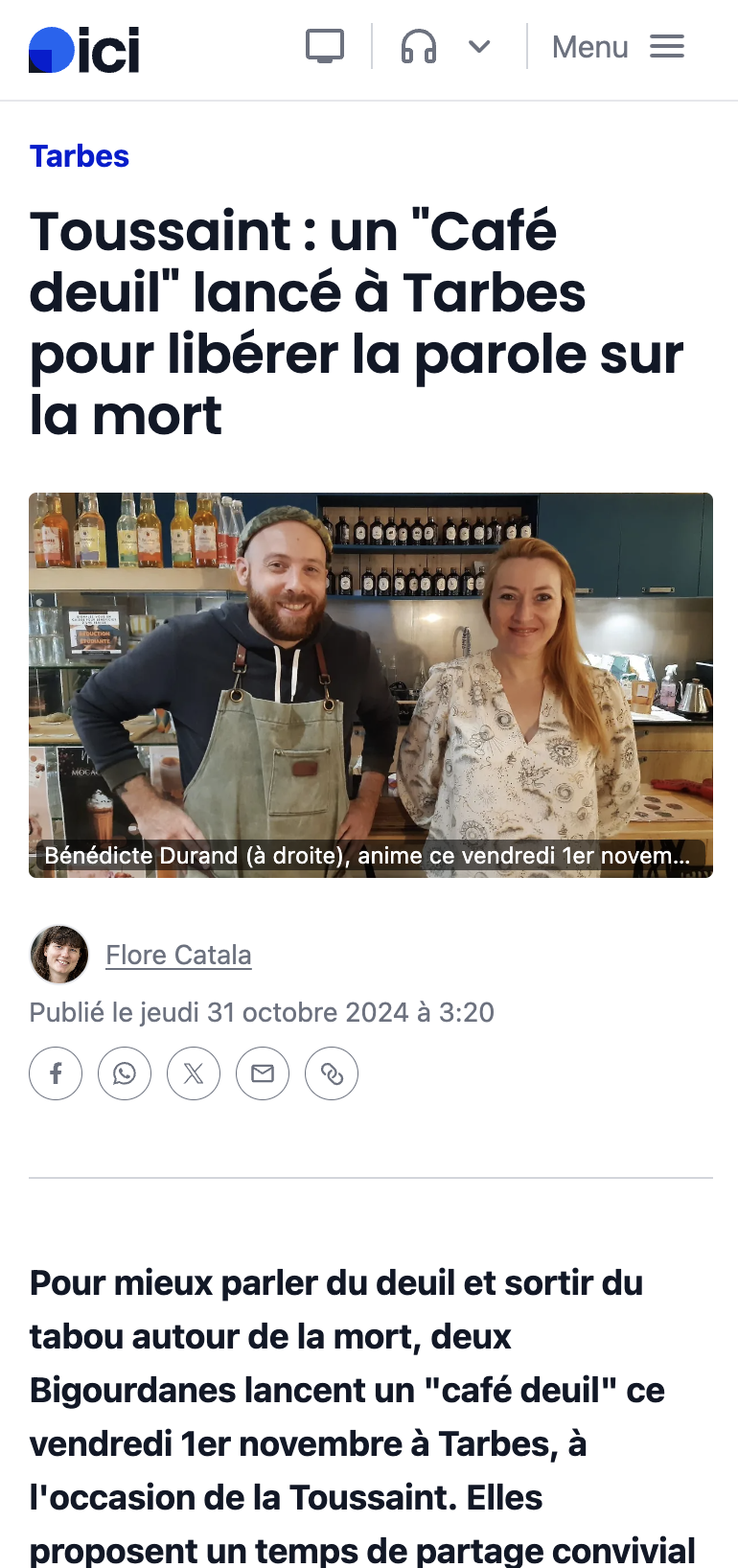 “J’ai vécu ce café deuil, comme une pause de douceur et d’échange. Un moment pour partager les fissures de nos coeurs, parler de nos défunts et repartir dans le mouvement de la vie un peu plus apaisé et le sourire aux lèvres. Un instant rempli d’émotions et la rencontre de belles personnes qui m’a fait un bien fou! Merci à toi Cécile pour cette belle parenthèse!”